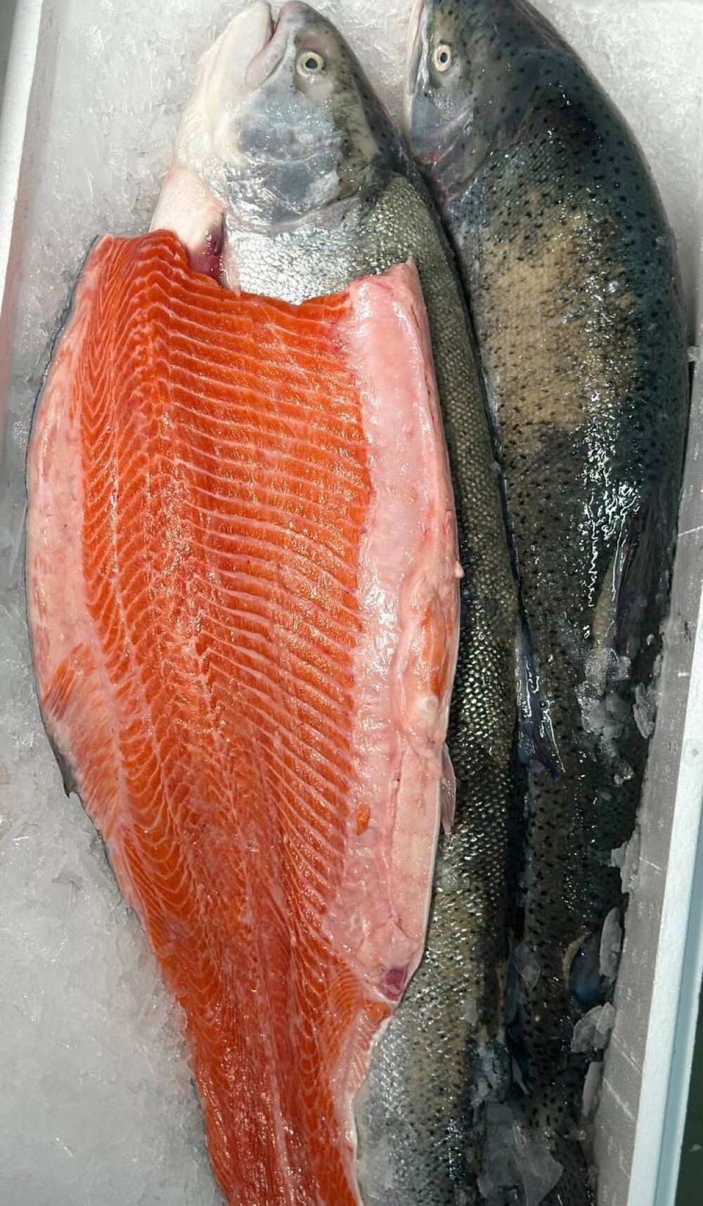 Свежая,Охлажденная крупная форель с плотным жирным красным мясом.И мраморным рисунком. Идеально подходит для запекания и засолки.