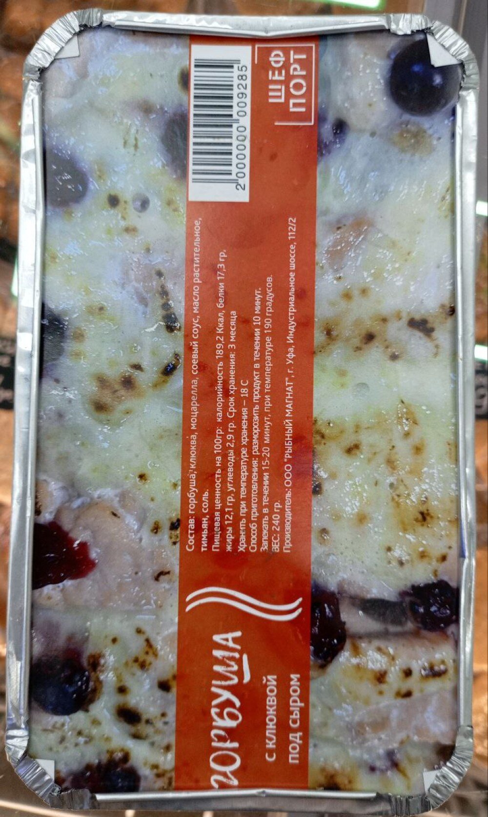 Состав: горбуша, клюква, соевый соус, моцарелла, растительное масло, тимьян, соль