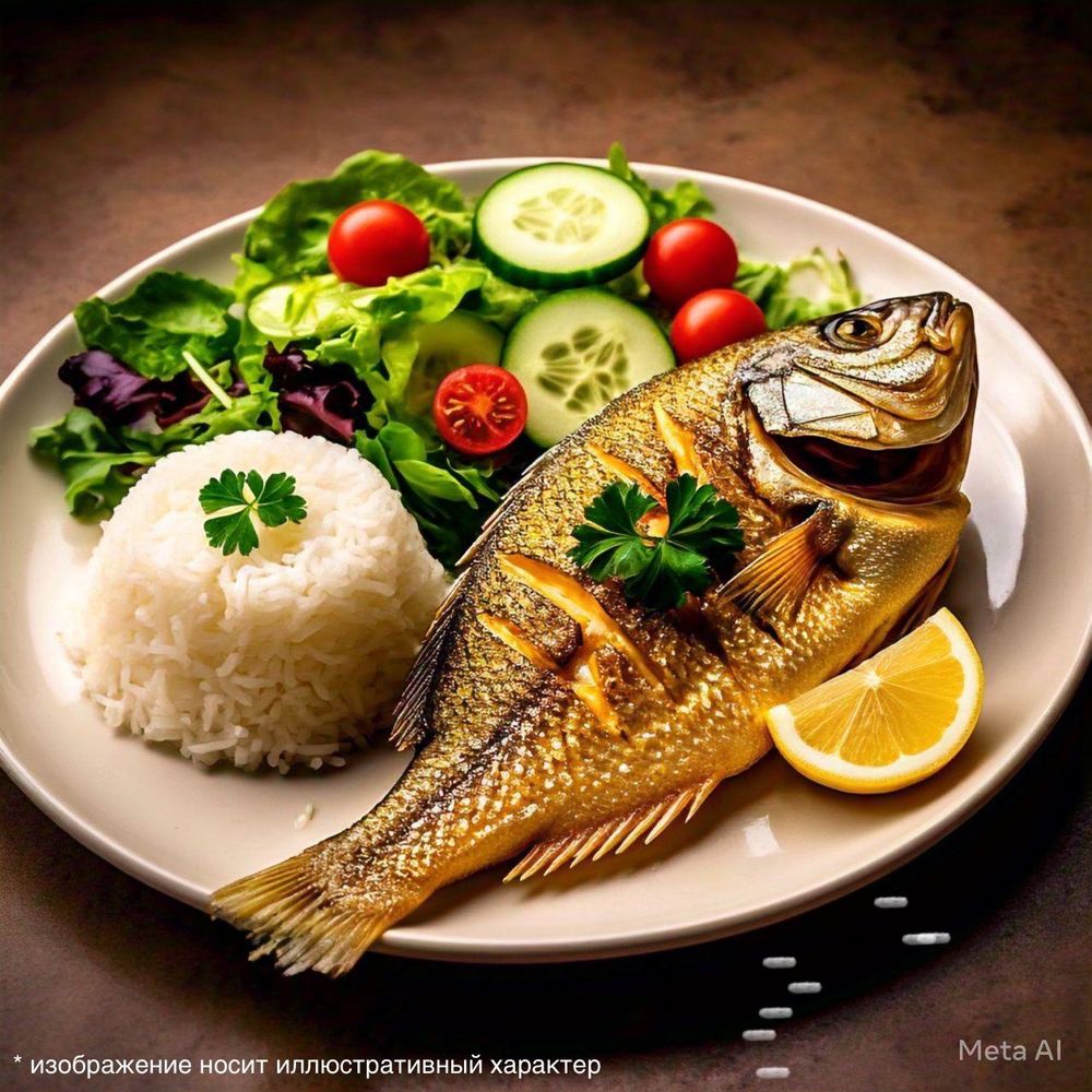 Дорадо пожаренный на гриле,ароматный рис Басмати,фирменный свежий салат, лепёшка из тандыра.А фирменный соус добавит блюду пикантности.