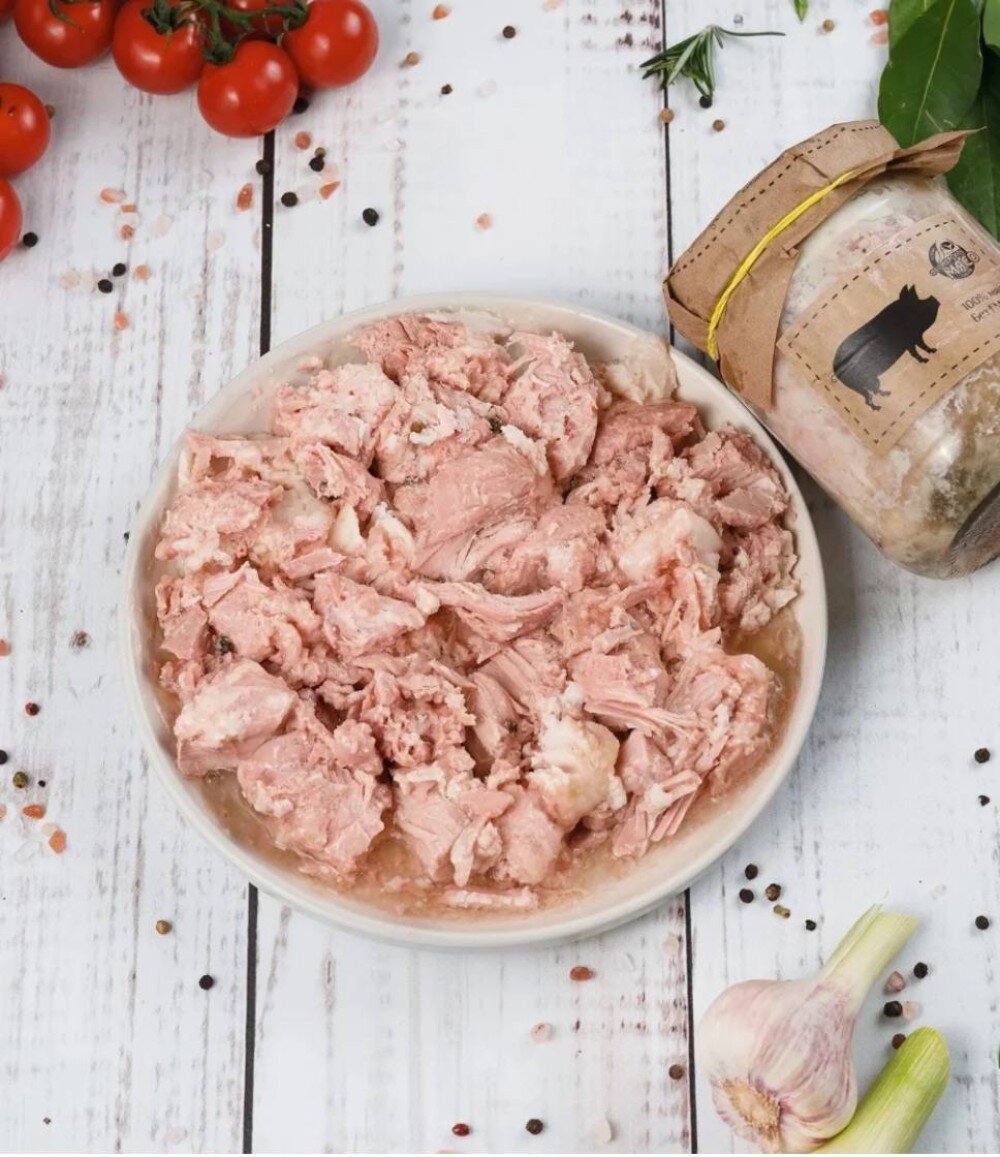 Тушенка изготовлена на собственном производстве из фермерской свинины по классической рецептуре, мясо получается нежным и сочным. Для тушения используется маложирная свинина. В мясе сохраняется много минеральных веществ, микроэлементов, белок тушеного мяса усваивается легче. Продукт готов к употреблению. Удобно брать на дачу, рыбалку и, когда необходимо приготовить сытное вкусное блюдо быстро!