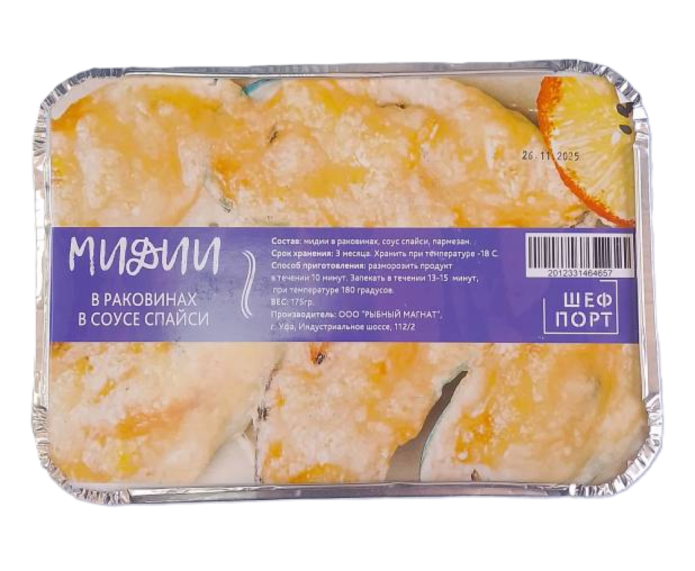 Способ приготовления: разморозить мидии в течение 10 минут, запекать в духовке при температуре 180°C в течение 13-15 минут.