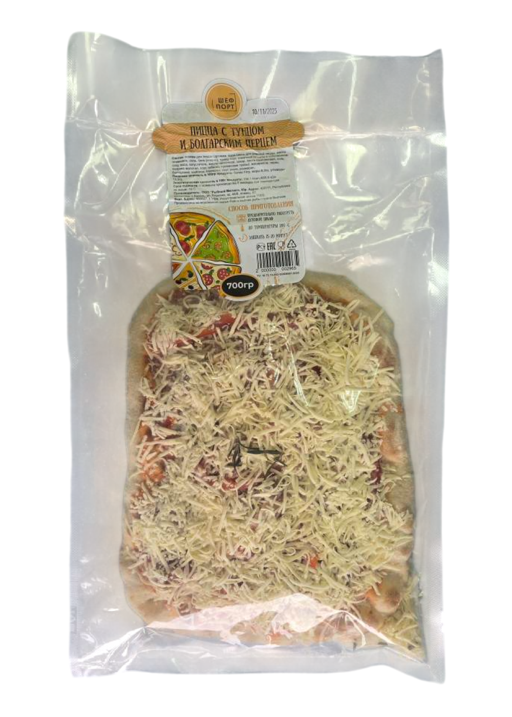 Начинка: Тунец, соус томатный, моцарелла, перец болгарский, майонез, пармезан, соус унаги, розмарин. Тесто: мука пшеничная в/с, вода, масло оливковое, дрожжи, соль, бига (опара).