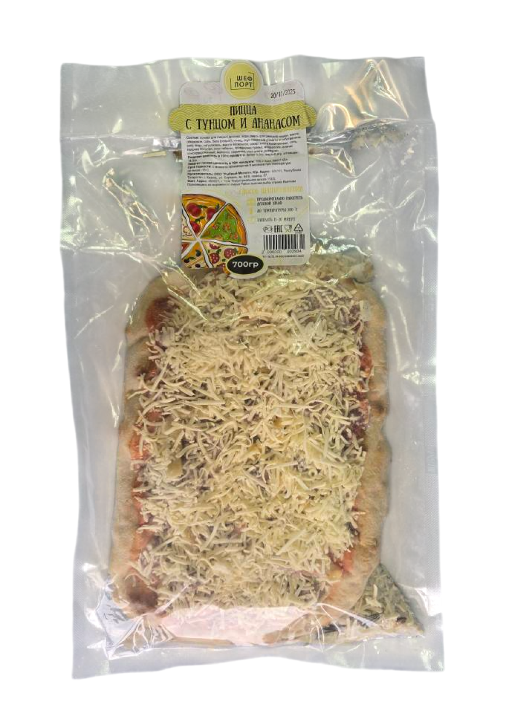 Начинка: Тунец, соус томатный, моцарелла, ананас консервированный, майонез, пармезан, соус унаги, розмарин. Тесто: мука пшеничная в/с, вода, масло оливковое, дрожжи, соль, бига (опара).
