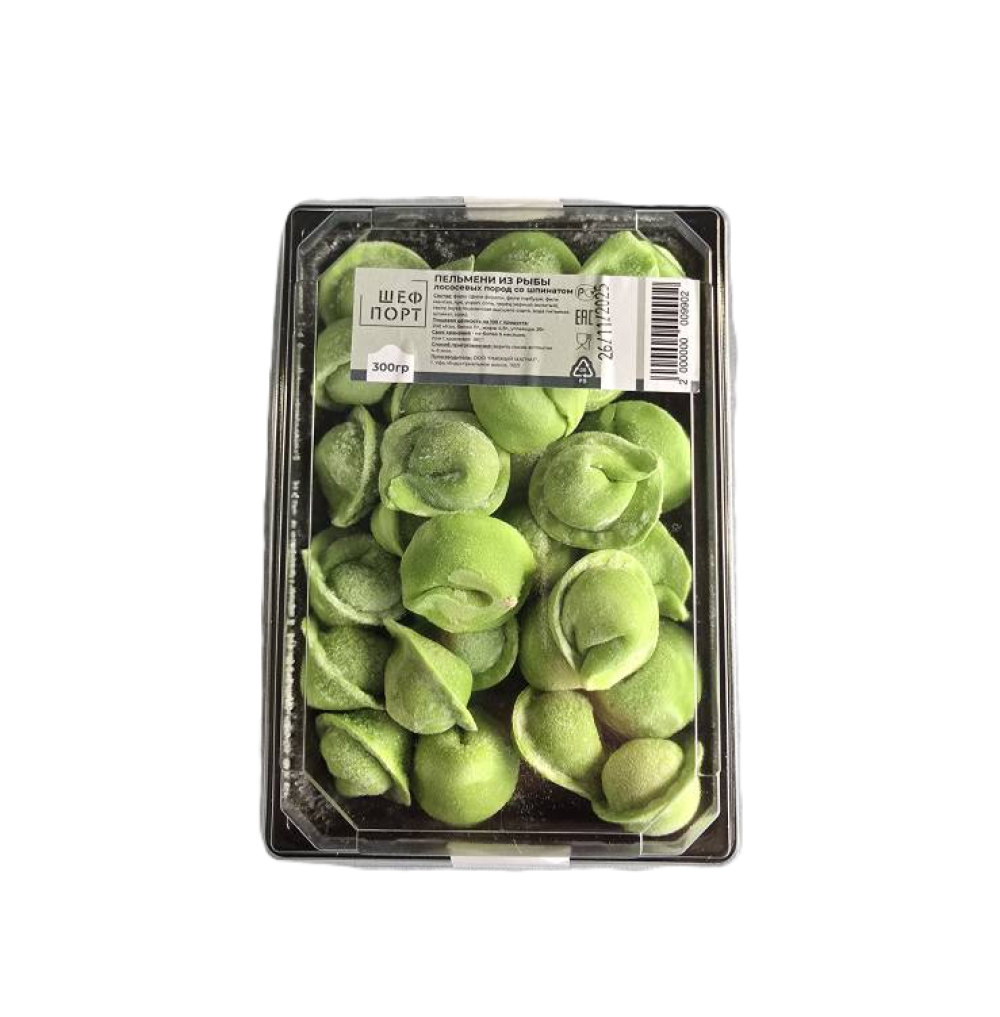 Фарш из горбуши, фарш из форели, фарш из минтая, лук жареный, укроп, перец черный молотый, соль. Тесто - мука пшеничная, вода, масло подсолнечное, шпинат, соль.