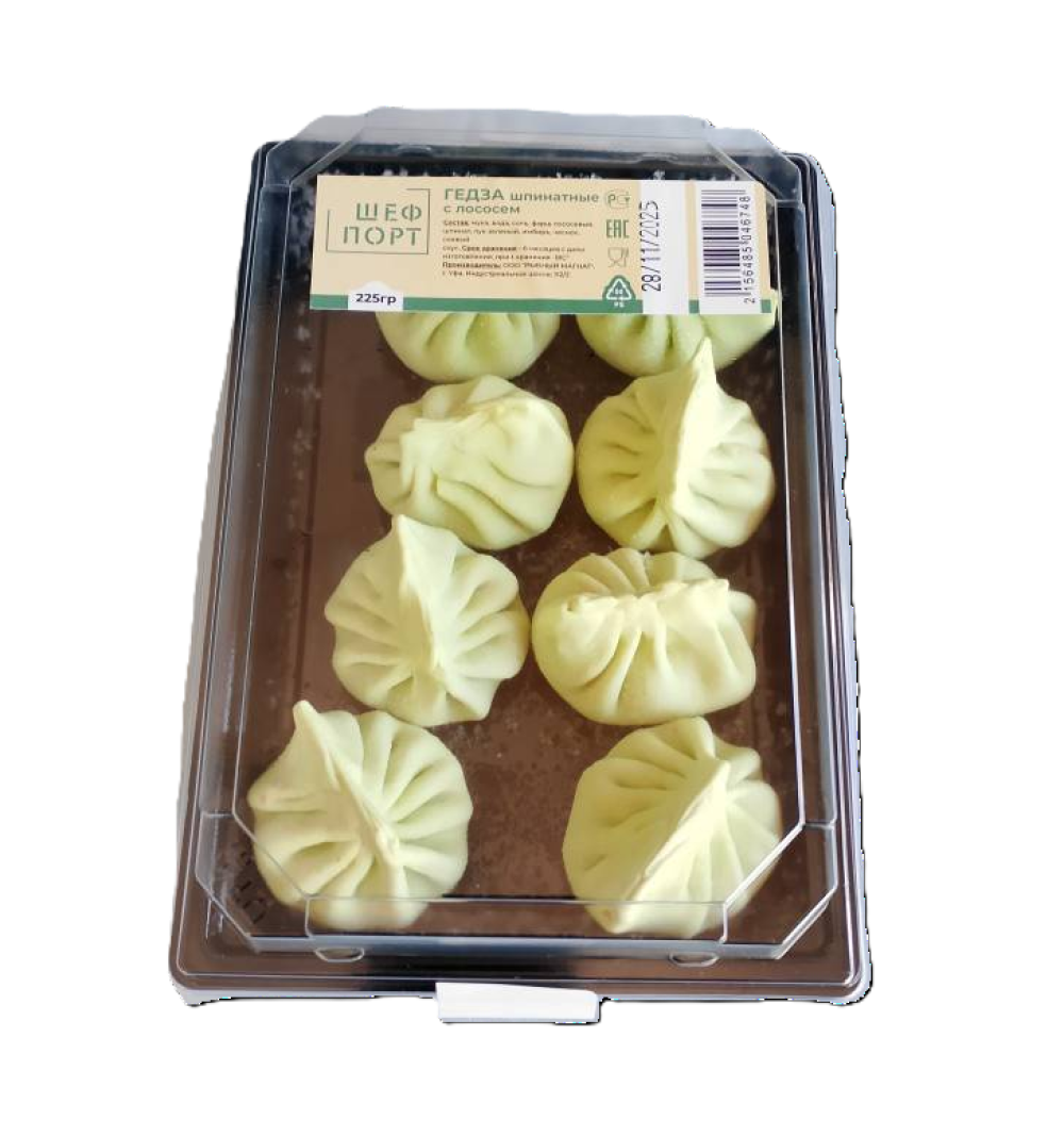 мука пшеничная, вода, соль, фарш лососевый, шпинат, лук зеленый, имбирь, чеснок, соевый соус.