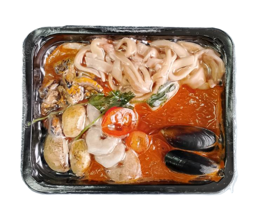 кокосовое молоко, филе кальмара, креветка ваннамей,мясо мидий, мидии в раковине, шампиньоны свежие, помидоры черри, кинза, паста том ям, масло рафинированное, лук шалот, перец чили, соль, мякоть чеснока, лимонная кислота, рыбный соус.